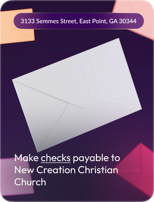 New Creation Christian Church is a part of Eddrick High Ministries which is a non profit 501(c)3 recognized organization. Your gifts to this ministry are tax deductible as allowed by law. Whether you are giving a tithe or an offering; we pray and know that God will richly bless you and multiply your seed sown.
